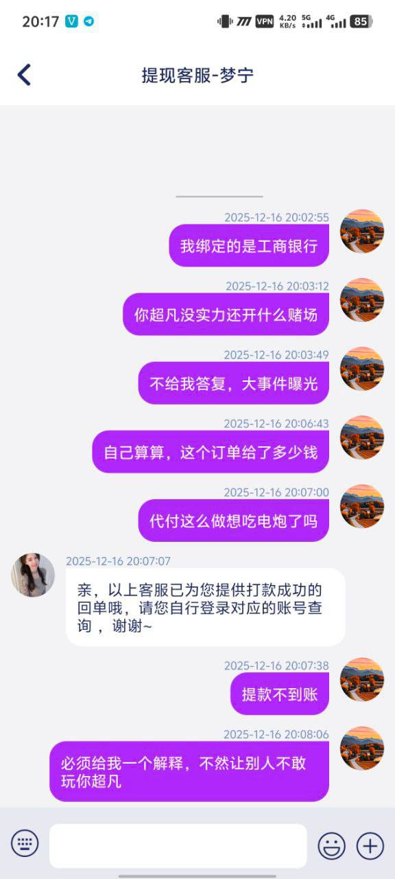 提现后等了10分钟仍未到账,用户反复联系客服催促打款,客服一直回复“打款中”。询问半个小时后,客服发来几张截图声称已到账,但用户发现截图上的账号信息与自己完全不符。